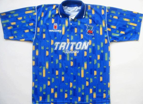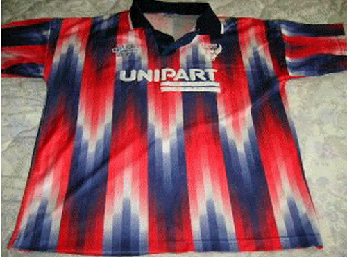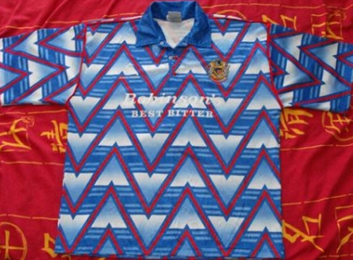 I skarp konkurranse med Norwich City sin fulglebæsjdrakt fra 1992/93, valgte jeg ut denne. Her har designeren tydeligvis akkurat fått seg PC, og laget et flott mønster. Som hadde gjort seg fint på gardinene på klubbens kontor.